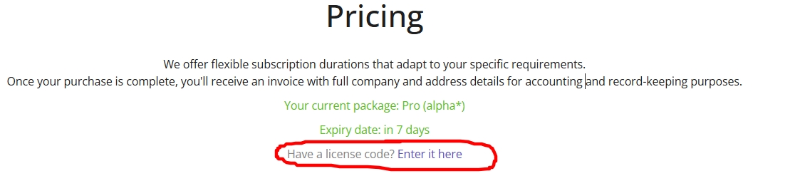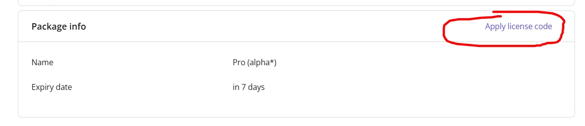 You will be redirected to the Package page and click on the link Apply license key.